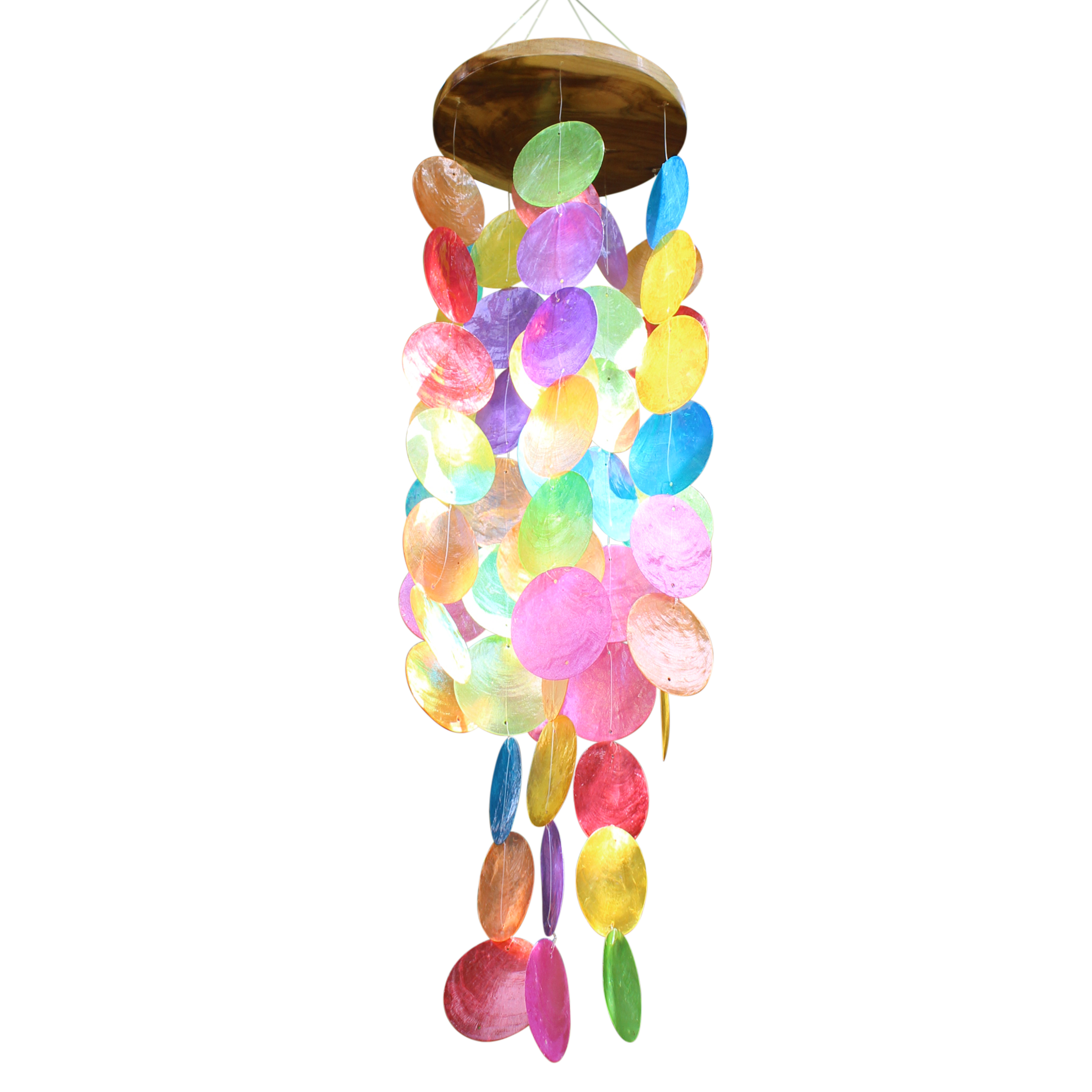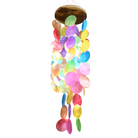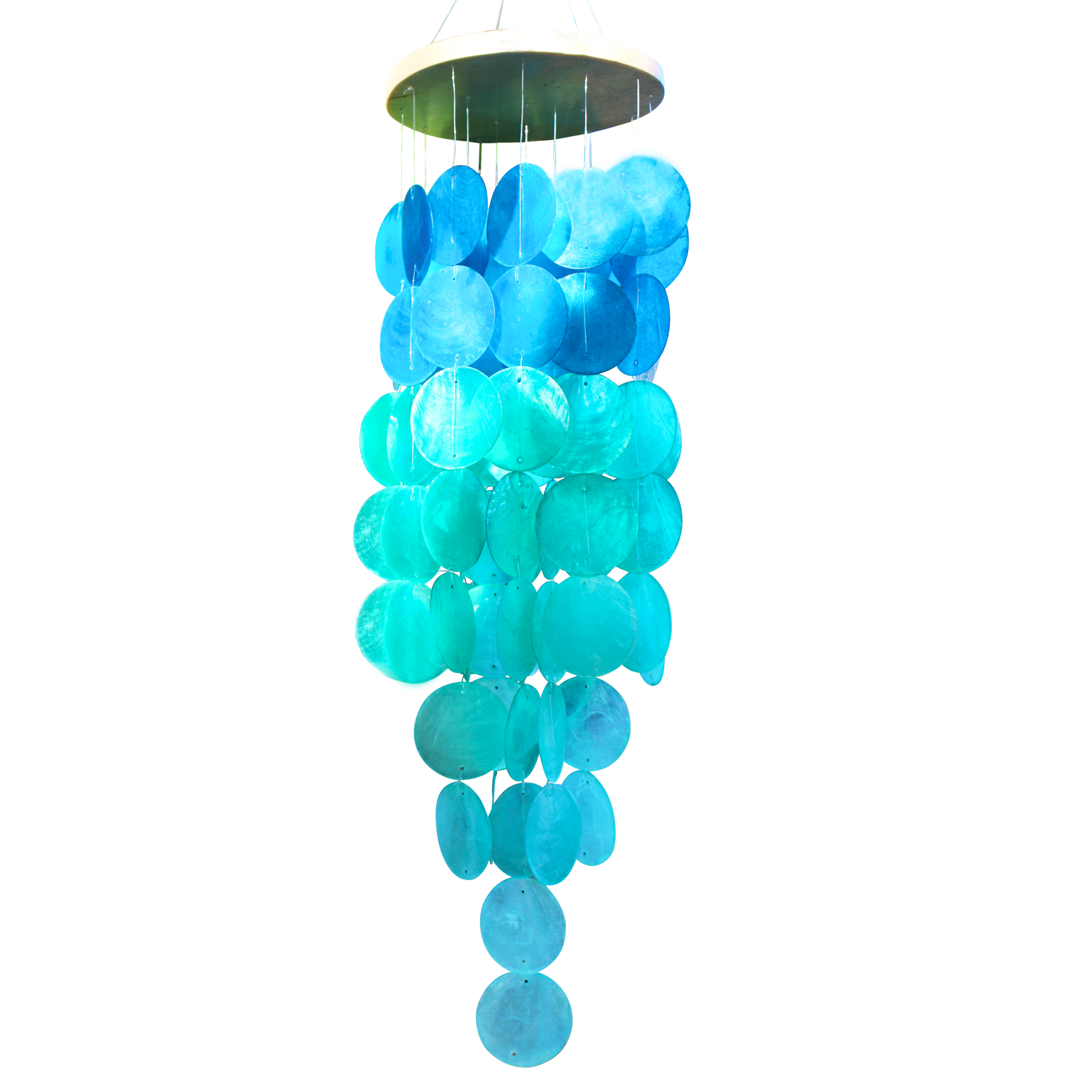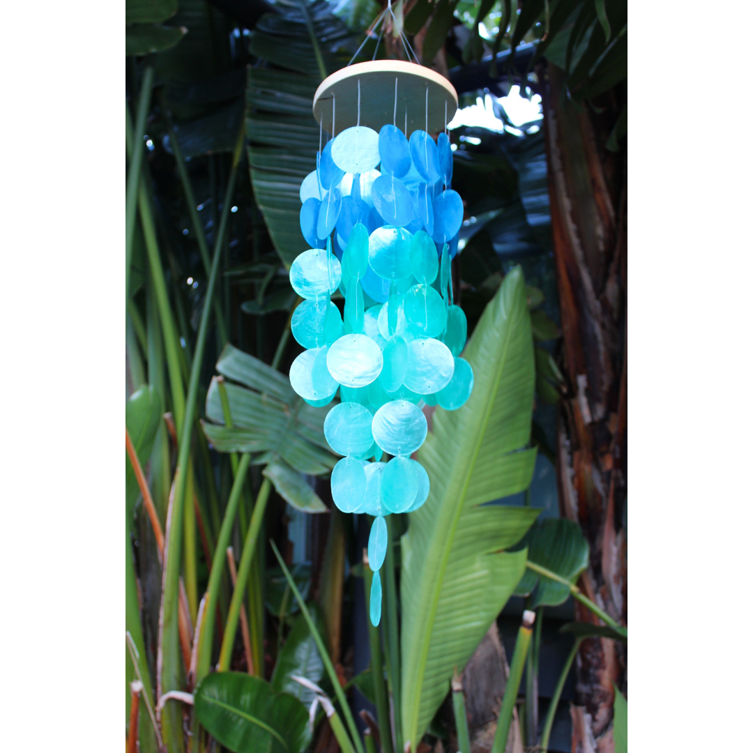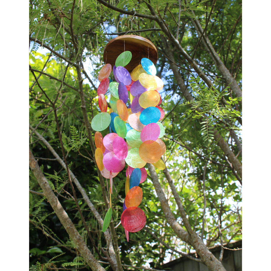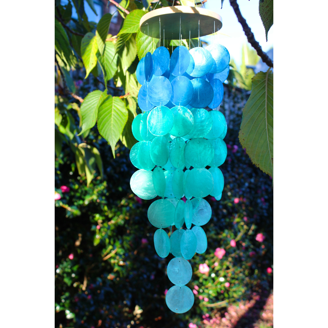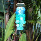 This beachy boho design features cascading capiz shells, gracefully hanging. Hang in a sheltered spot for a gorgeous shimmering effect.