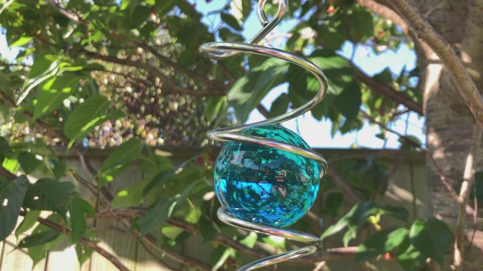 By pulling the wind spinner down, it is stabilised in the wind. Prepare to be hypnotised as the solid glass orb appears to magically climb the metal spiral as it spins.