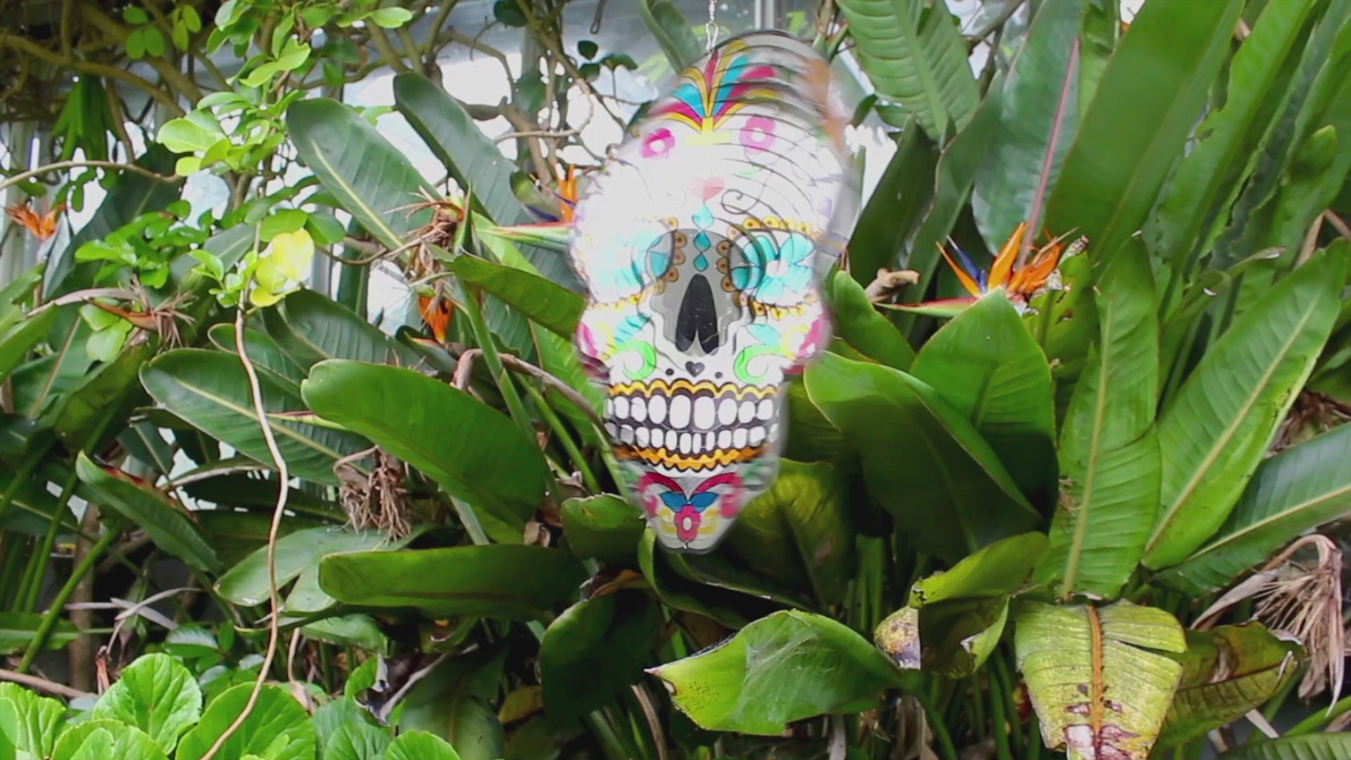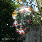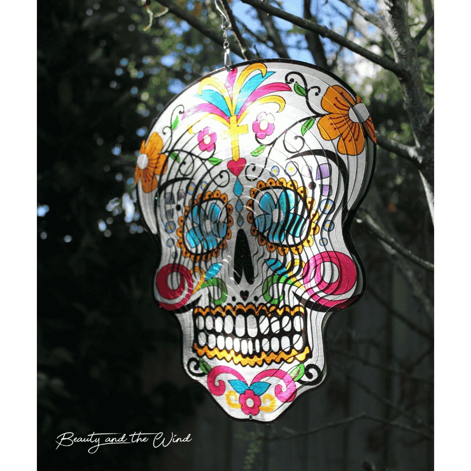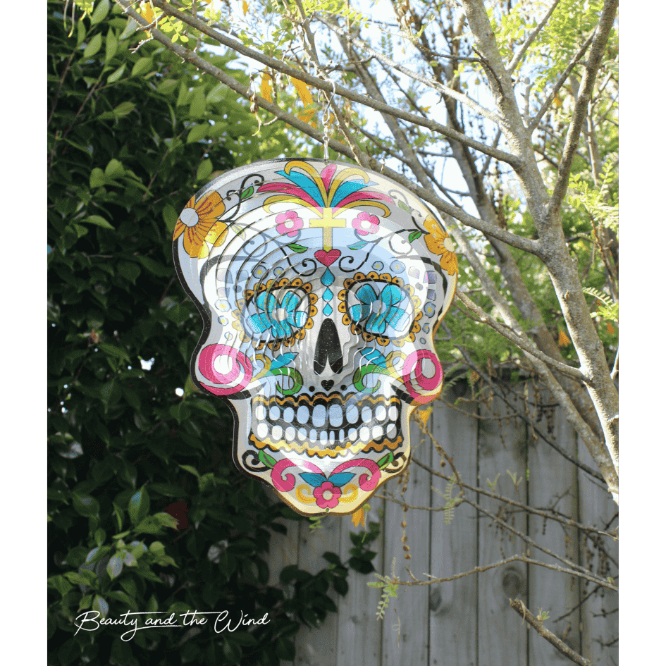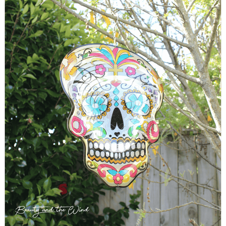 These wind spinners twist in a gentle breeze or a strong gust, creating hypnotic patterns and reflections of light. Watch in awe as the hypnotic patterns twirl and dance in the wind while reflecting light. This beautifully painted Sugar Skull is sure to catch your attention. Hang from a tree, patio or gutter and bring your garden to life!