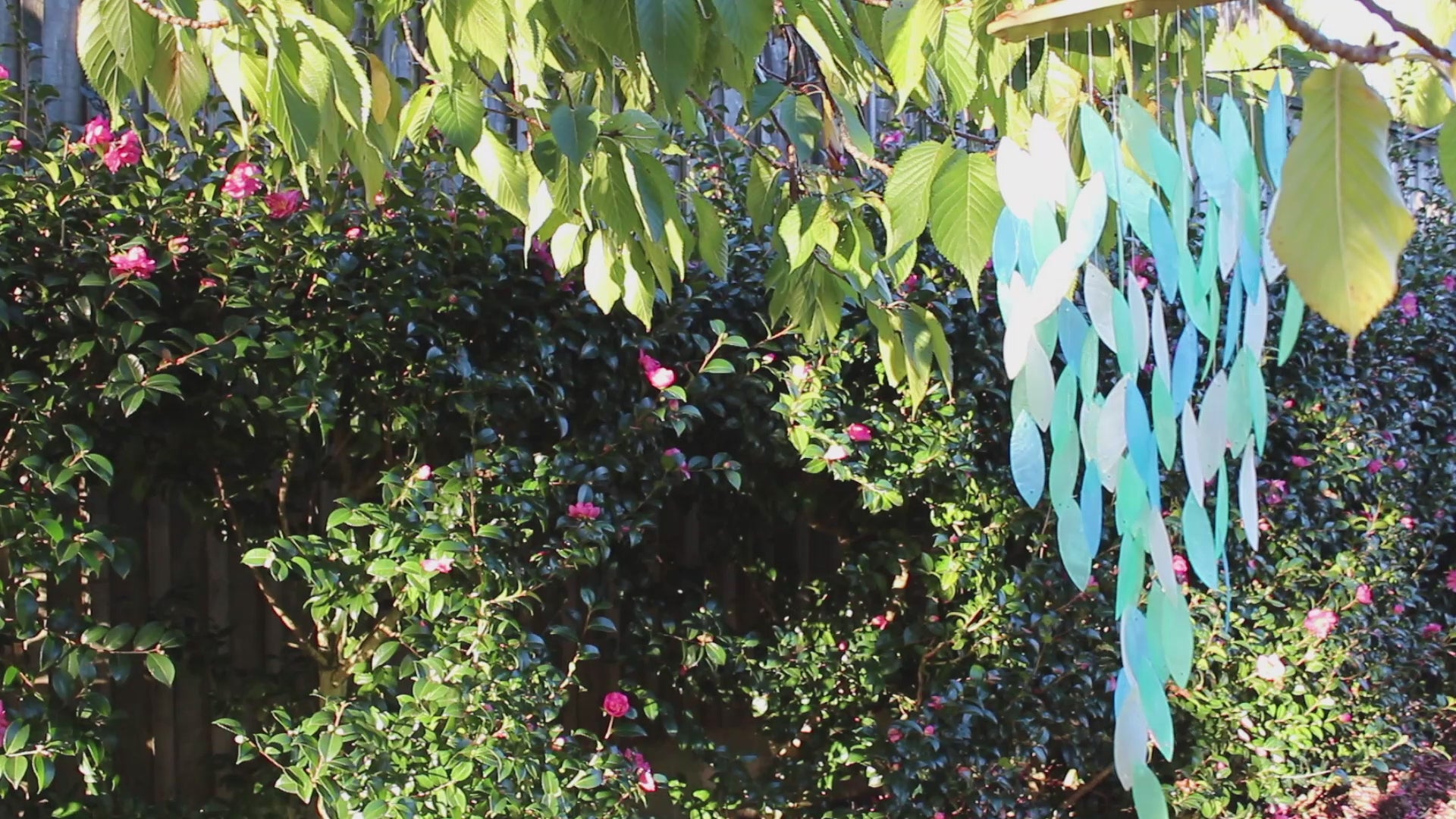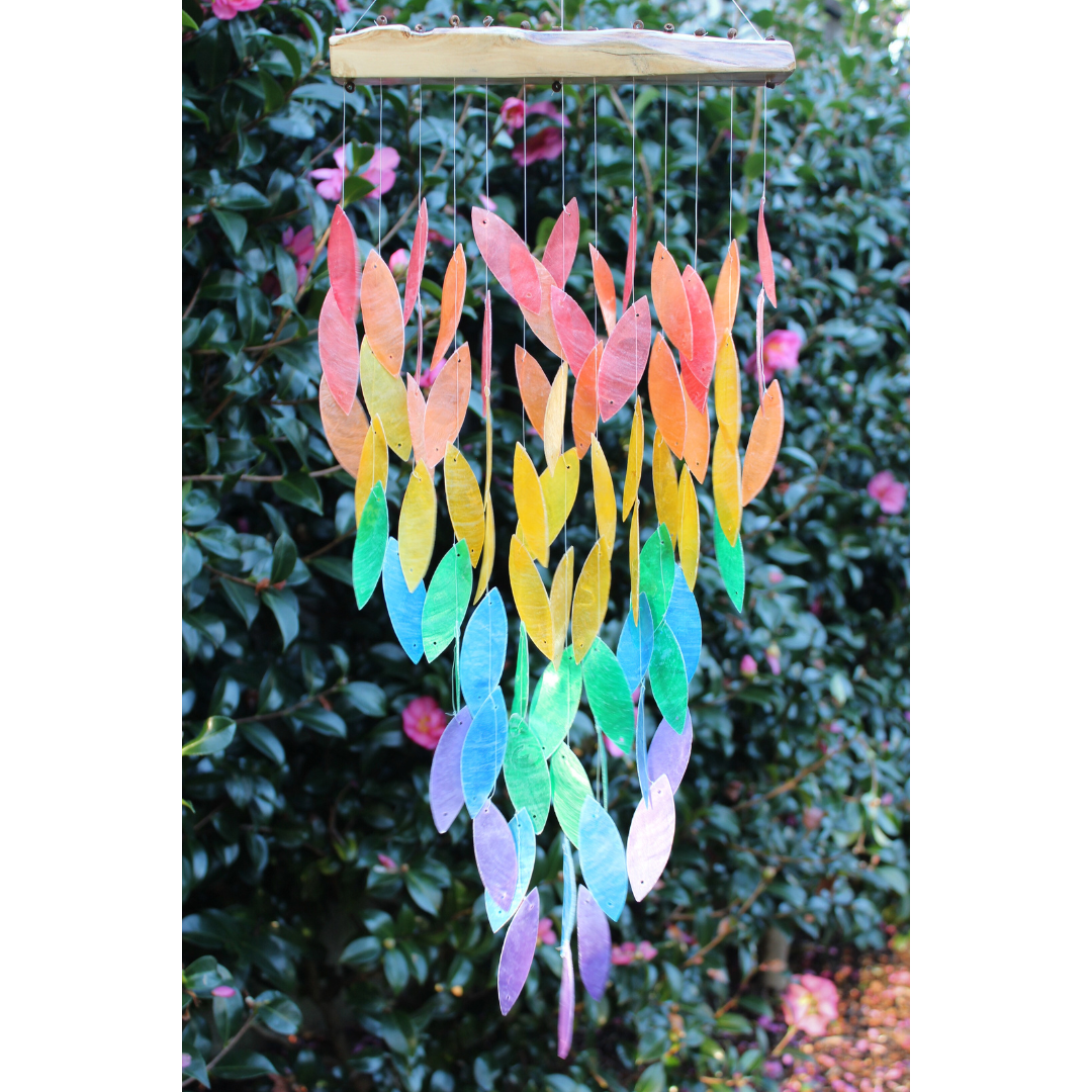 This nature-inspired design uses capiz shells in the shape of leaves; they cascade down into a triangle formation. Hang in a sheltered spot for a gorgeous shimmering effect.